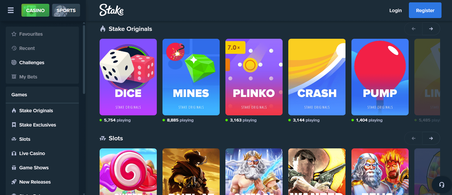 Löydät yli 3 000 peliä, mukaan lukien kolikkopelejä, live-jakajapöytiä, pokeria ja Stake Originalsia.