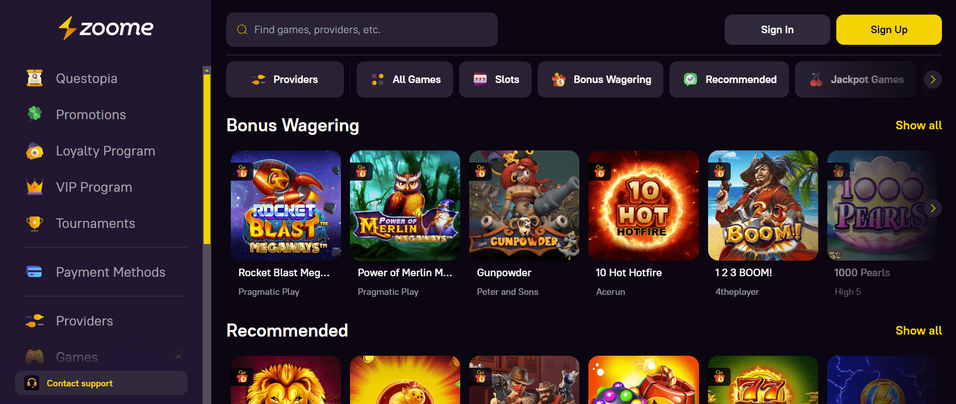 Zoome Casino on nettikasino, jossa pelaajat voivat nauttia laajasta valikoimasta pelejä huipputarjoajilta, kuten NetEnt, Play’n GO, Microgaming, Pragmatic Play, Endorphina, Yggdrasil Gaming ja muut. Sivusto tukee useita eri kieliä ja siitä voi nauttia useimmilla alustoilla, kuten tietokoneilla, kannettavilla tietokoneilla, älypuhelimilla ja tableteilla. Pelaajat voivat myös tuntea olonsa turvalliseksi, sillä kasino on täysin Curaçaon hallituksen lisensoima ja sääntelemä.