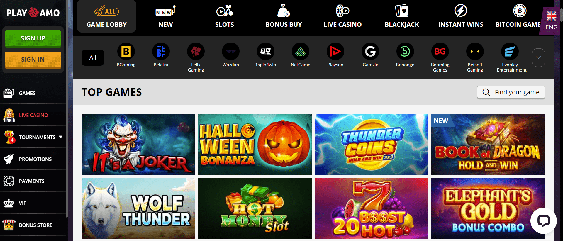Il vantaggio principale (e probabilmente l'unico) del casinò PlayAmo è l'ampia selezione di giochi, che comprende slot machine, giochi da tavolo, giochi da casinò live, video poker e keno. La maggior parte dei giochi è disponibile in modalità divertimento anche senza un account.
